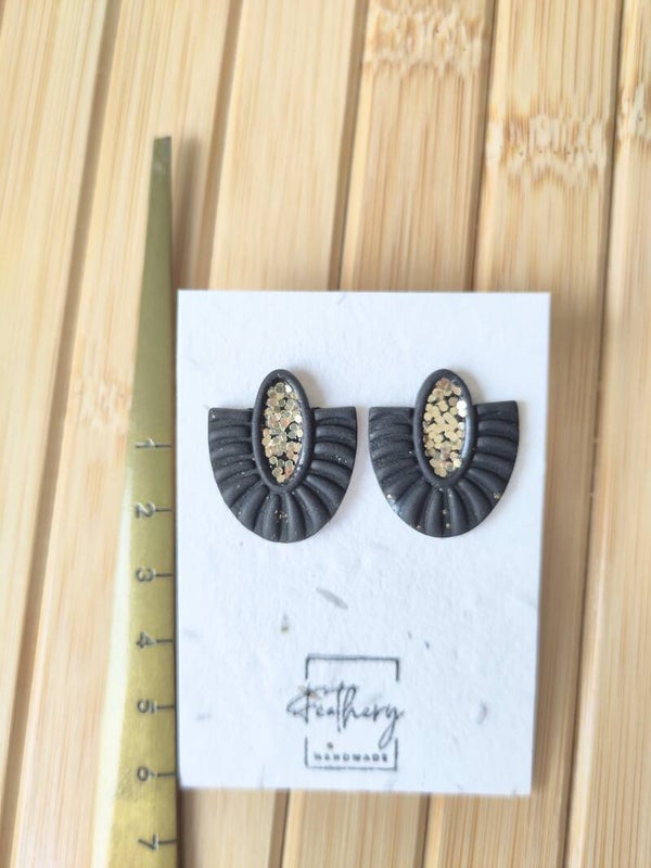 Slechts één paar van deze oorbellen zijn beschikbaar. De gouden glitters en goudfolie geven een chique effect aan de zwarte oorbellen.